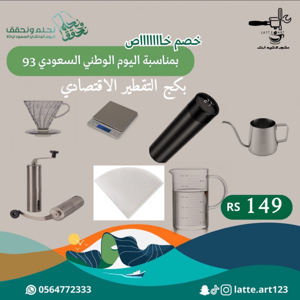 بكج التقطير الاقتصادي مكون من قمع وسيرفر زجاج وابريق ستيل وميزان وفلاتر ورقيه وطاحونة يدويه وحافظة حرارة