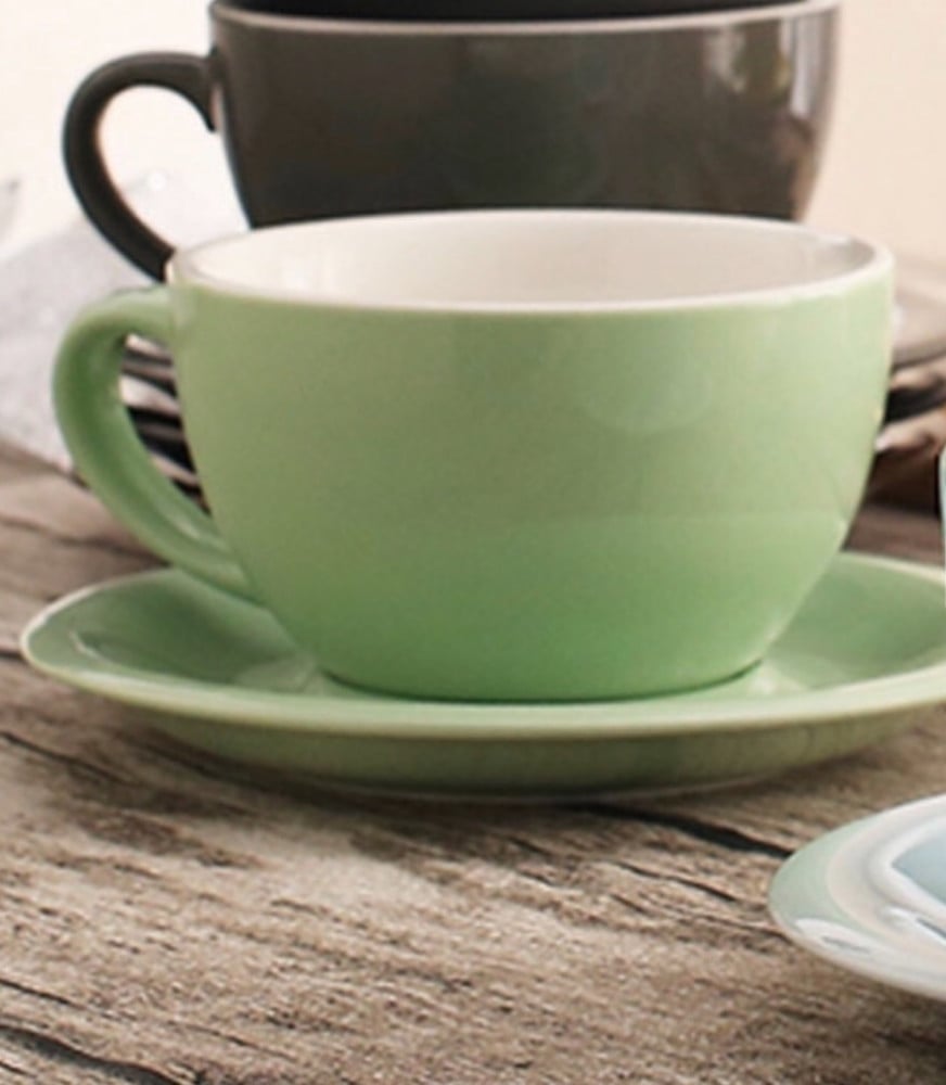 كوب اخضر اللون مصنوع من الخزف مزود بجدار سميك مع صحن