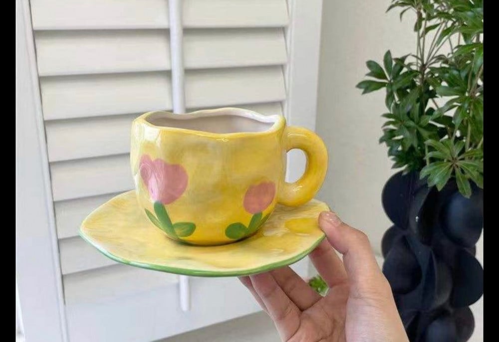 كوب اخضر اللون مصنوع من الخزف مزود بجدار سميك مع صحن